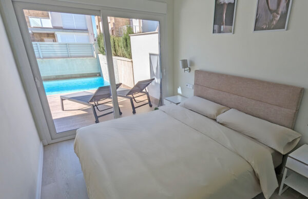 De luxe open keuken is voorzien van een 6 persoons eettafel, een elektrische kookplaat, oven, magnetron, koel / vries combinatie, vaatwasser, waterkoker en koffiezet apparaat. De “master bedroom” beschikt over een tweepersoonsbed, een badkamer ensuite en een ruime inbouwkast. De 2e slaapkamer beschikt ook over een tweepersoonsbed en een inbouwkast. De 3e slaapkamer heeft 2 eenpersoonsbedden en ook een inbouwkast. Tussen de slaapkamers is een 2e badkamer gelegen. Vanuit de woonkamer en de masterbedroom kunt u het ruime terras betreden om een duikje te nemen in u prive zwembad.
